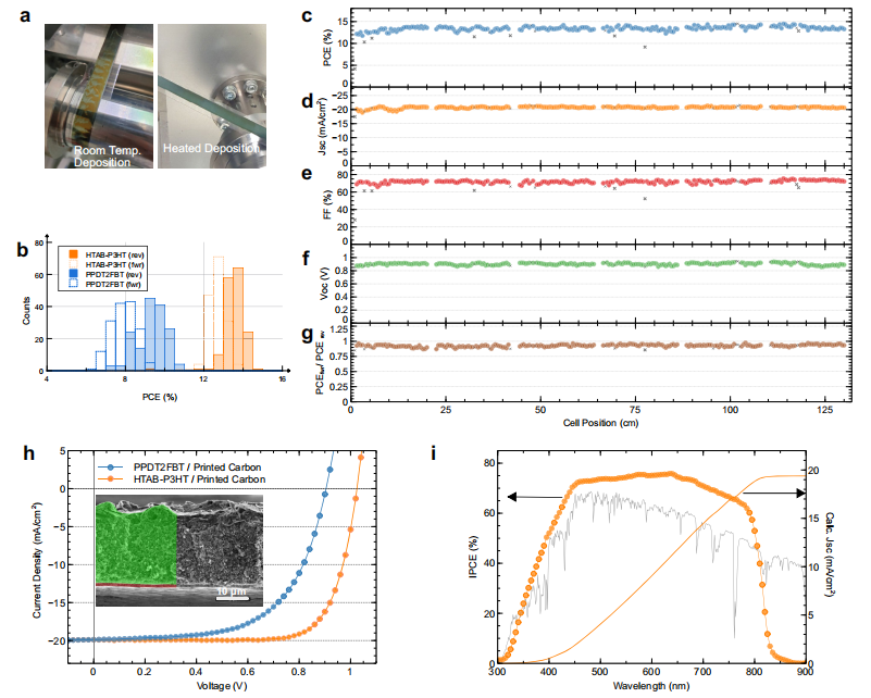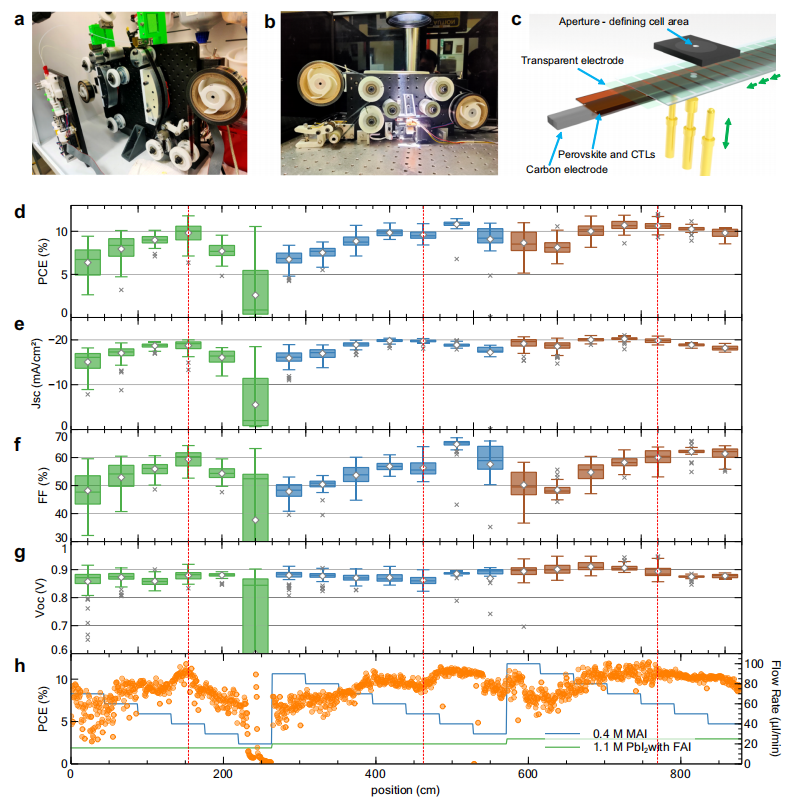 a) 定制卷對(duì)卷(R2R)狹縫涂布機(jī),單日可制備數(shù)千個(gè)獨(dú)立太陽(yáng)能電池。