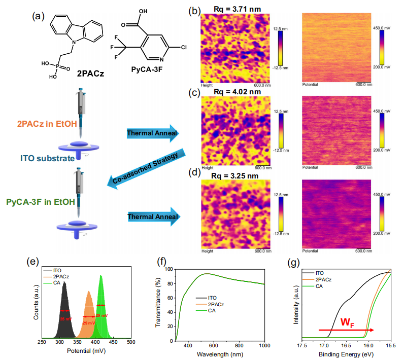 · 共吸附(CA)策略:PyCA-3F通過氫鍵限制2PACz遷移(圖2d),覆蓋率提升20%,形成均勻雙分子層。