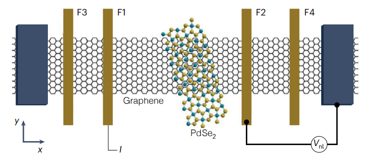 示意圖顯示單層石墨烯自旋通道(黑色蜂窩晶格)與五邊形結構PdSe2(藍黃原子結構)的界面,該界面誘導出各向異性自旋-軌道耦合(SOC)。器件包含四個鐵磁電極(F1–F4;棕色)和兩個普通金屬接觸電極(深藍色)。自旋極化電流I從F1注入,通過石墨烯擴散后在F2檢測,同時通過測量非局部電壓Vnl來探測自旋弛豫。該裝置可用于研究鄰近效應調控的石墨烯中柵壓可調的各向異性自旋動力學。(根據文獻5改編,Springer Nature Limited授權)。