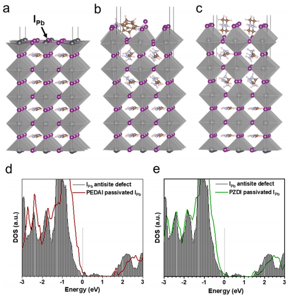 *‌PZDI鈍化(圖e)‌:缺陷態峰完全消失,費米能級處態密度趨近于零,證實其高效鈍化效果。