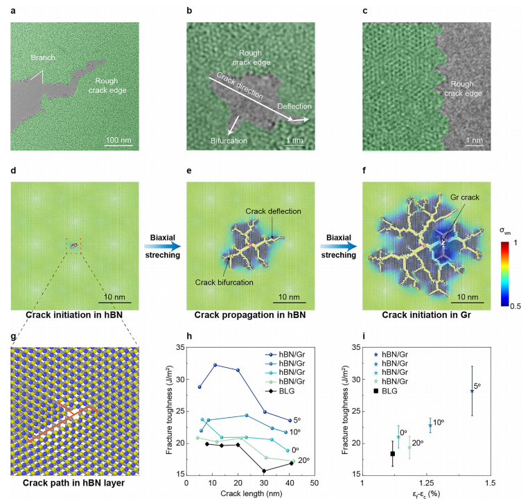 1、‌斷裂韌性提升‌:hBN形成粗糙裂紋邊緣,穩定裂紋擴展路徑,同步調控石墨烯斷裂發展,避免超晶格脆性分裂。
