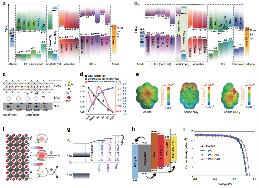 圖4 鈣鈦礦與電荷傳輸層之間的界面修飾。n-i-p和p-i-n結構鈣鈦礦太陽能電池(PSCs)中鈣鈦礦與電荷傳輸層的能級圖。經參考文獻293許可復制,版權歸2018年Wiley-VCH所有。c SnO?與鈣鈦礦薄膜之間的自組裝單分子層。(BA為苯甲酸,PA為4-吡啶甲酸,CBA為4-氰基苯甲酸,ABA為4-氨基苯甲酸,C3為3-丙酸)。d 經不同自組裝單分子層處理后的鈣鈦礦的功函數及對應的光電轉換效率(PCE)。經參考文獻63許可復制,版權歸2017年美國化學學會所有。e 三個分子的化學結構及靜電勢映射圖像。f 不同官能團對庫侖力調節及其表面偶極方向的影響示意圖。g 經−OCH?、苯胺和−NO?分子處理后的CsPbBr?薄膜的能級圖示意圖。經參考文獻64許可復制,版權歸2021年美國化學學會所有。h 能帶對齊圖。i 經不同分子處理后的PSCs的J-V曲線。經參考文獻65許可復制,版權歸2020年美國化學學會所有。