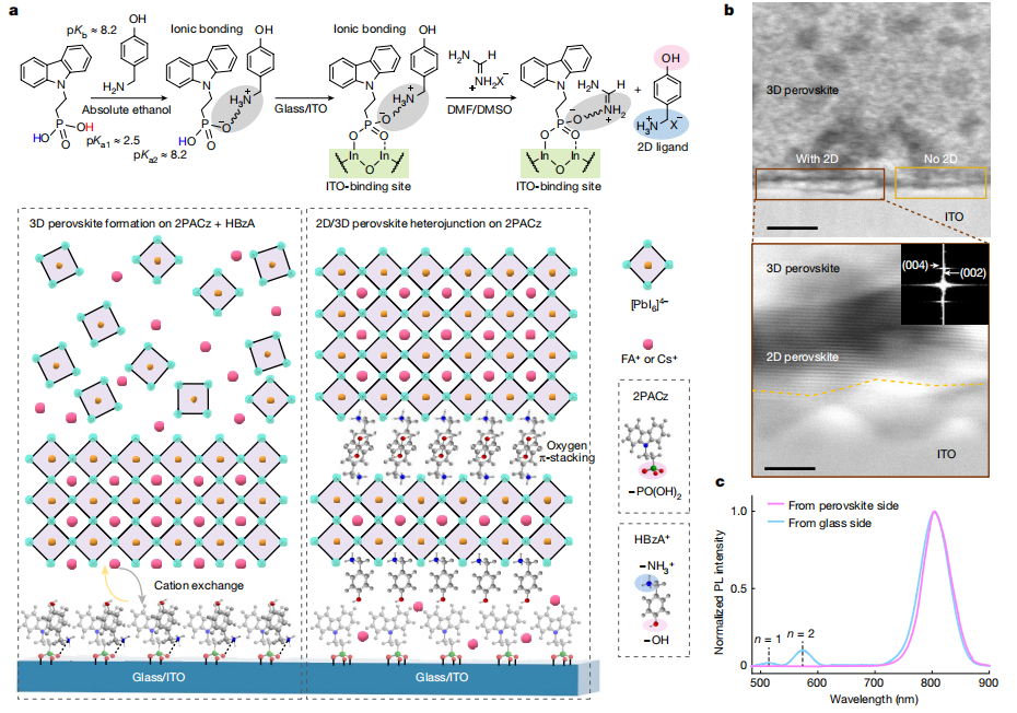 a,頂部:2D配體在ITO/2PACz表面形成并釋放的機制。底部:在ITO/(2PACz + HBzA)上3D鈣鈦礦形成的機制以及底部界面處的陽離子交換(左);在ITO/2PACz底部接觸層上的2D/3D異質結(右)。