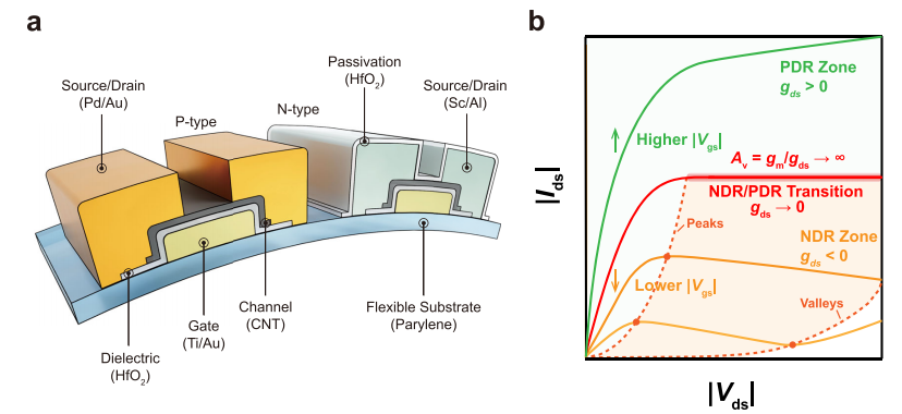 圖1 | CMOS碳納米管薄膜晶體管結構及其門極調控負微分電阻(NDR)行為與本征增益奇點示意圖