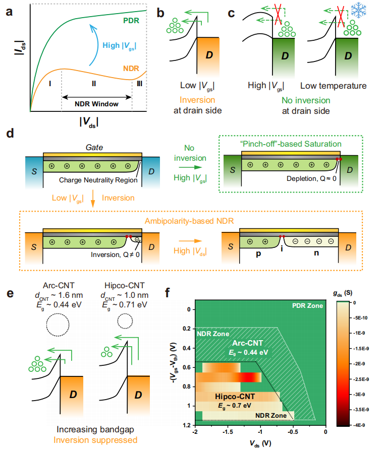 *帶隙相關性(e-f):柵壓對NDR/PDR邊界的控制源于碳納米管帶隙(~0.6–1.0 eV)對載流子濃度的敏感調制。