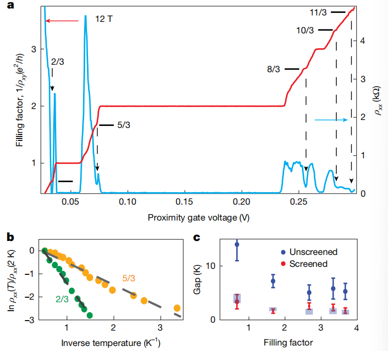 圖4 | 接近門控設(shè)備中的分?jǐn)?shù)QHE。a,ρxy和ρxx在12 T和50 mK(紅色和藍(lán)色曲線;左軸和右軸,分別)。數(shù)據(jù)作為接近門電壓的函數(shù)繪制,由于石墨門中的2.5維QHE和負(fù)量子電容效應(yīng)31,無(wú)法準(zhǔn)確轉(zhuǎn)換為載流子密度。ρxy以ν=(h/e2)/ρxy的形式繪制。水平線標(biāo)記分?jǐn)?shù)板極的預(yù)期位置。箭頭指示相應(yīng)的ρxx最小值。b,用于提取激活能(activation energies)的電阻最小值(normalized by values at 2 K)的Arrhenius圖,對(duì)于ν=2/3和5/3的情況。c,接近門控設(shè)備S1(紅色符號(hào))和遠(yuǎn)程門控設(shè)備(帶有誤差條的藍(lán)色符號(hào))的分?jǐn)?shù)QHE間隙的比較。藍(lán)色矩形符號(hào)是預(yù)期的間隙,通過(guò)使用?B/2d抑制因子(d=1nm和?B≈7.5nm,對(duì)于12T)計(jì)算得出。