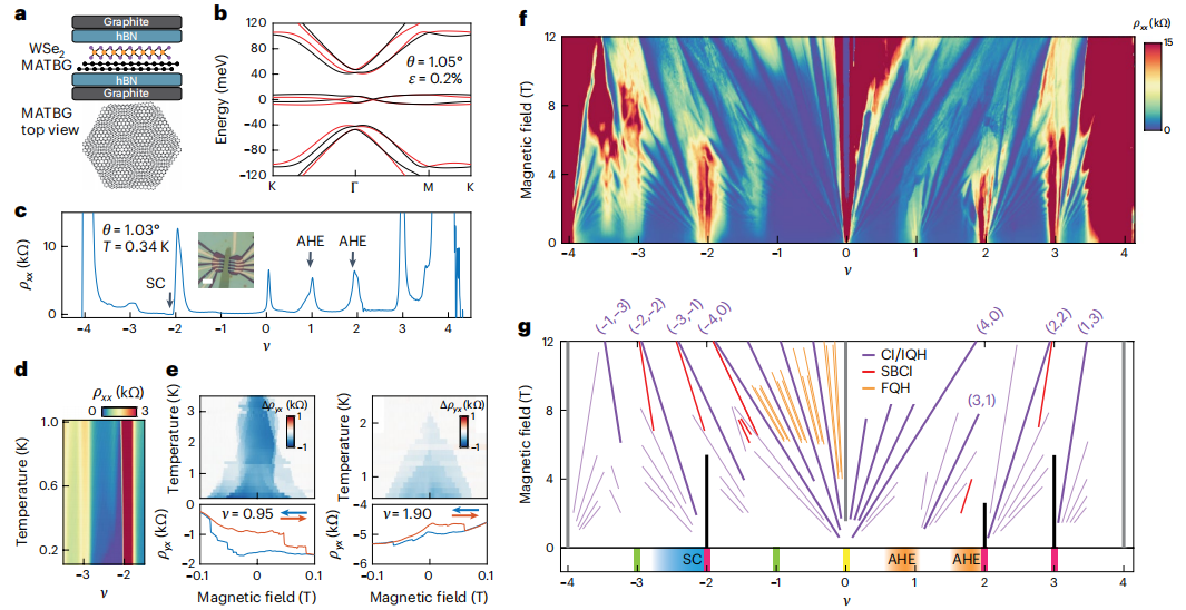 提供了器件中觀察到的不同電子相的示意圖,包括超導(dǎo)、反常霍爾效應(yīng)、有能隙和無能隙的非公度凱庫勒螺旋態(tài)、半金屬相、陳絕緣體、整數(shù)量子霍爾態(tài)、SBCI態(tài)和FQH態(tài)等。這些相的存在和相互轉(zhuǎn)化是強關(guān)聯(lián)電子系統(tǒng)研究的核心內(nèi)容。