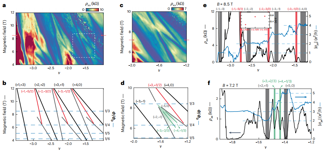 圖2 | 對稱性破缺陳絕緣體(SBCI)態(tài)的級聯(lián)。a,聚焦于空穴摻雜側(cè)SBCI態(tài)的ρxx朗道扇形圖的放大測量圖。b,最穩(wěn)定帶隙態(tài)的示意圖。左側(cè)y軸顯示相應(yīng)的磁通比Φ/Φ0。c,對a中白色虛線框標(biāo)示區(qū)域的進一步放大圖。d,最穩(wěn)定帶隙態(tài)的示意圖。綠色陰影表示總陳數(shù)為-3的磁子帶。e,在B=8.5T時測量的|σyx|(右軸)和ρxx(左軸)(a中的紅色箭頭)。陰影區(qū)域標(biāo)記了SBCI態(tài)(紅色)和主序列相關(guān)陳絕緣體(CCI,灰色)。插圖:b中標(biāo)記的三個SBCI態(tài)的熱激活能隙測量值。f,在B=7.2T時的相同測量(c中的紅色箭頭)。綠色陰影表示d中觀察到的SBCI態(tài)。