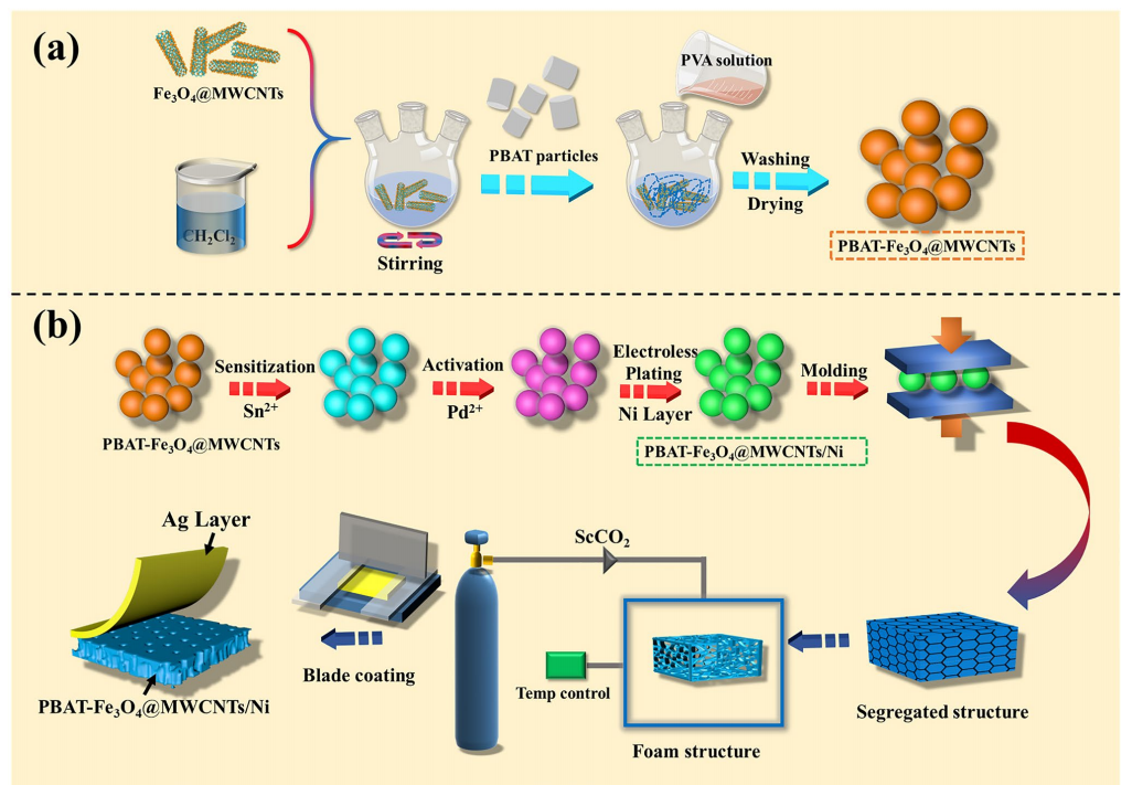 圖1 a PBAT-Fe?O?@MWCNTs微球的合成示意圖;b PBAT-Fe?O?@MWCNTs/Ni/Ag復(fù)合泡沫材料的制備示意圖