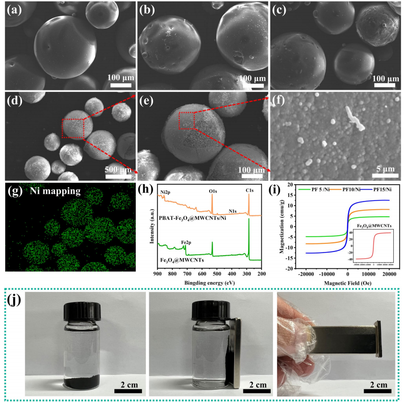 d–f 不同放大倍數(shù)下PBAT-Fe3O4@MWCNTs/Ni微球的形貌;