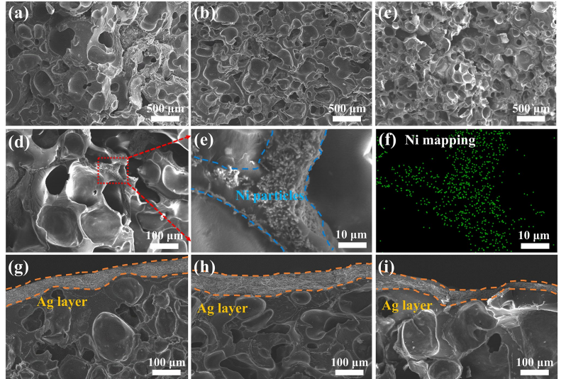 該系列SEM圖像揭示了填料含量對泡沫結(jié)構(gòu)的影響以及金屬組分(Ni、Ag)的分散狀態(tài),核心在于驗(yàn)證材料的“多級結(jié)構(gòu)設(shè)計”是否實(shí)現(xiàn):