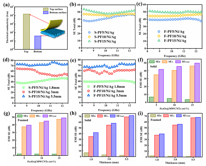 屏蔽機(jī)制的可控性:Ag層與磁性填料的協(xié)同作用實(shí)現(xiàn)了“吸收-反射”功能分區(qū),而發(fā)泡結(jié)構(gòu)進(jìn)一步優(yōu)化電磁波衰減路徑,最終達(dá)成文獻(xiàn)提出的“低反射、高吸收”特性。