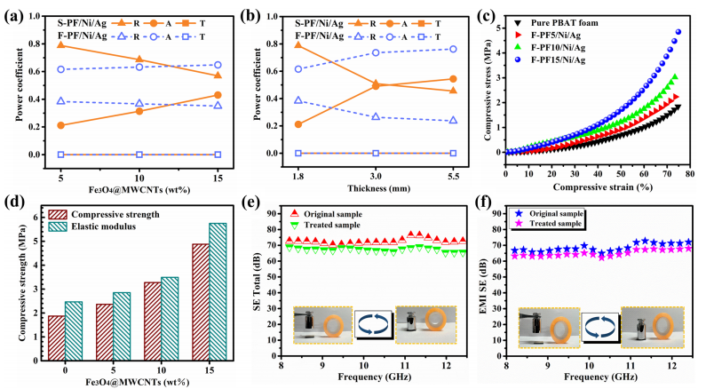 b–c 不同F(xiàn)e?O?@MWCNTs含量的S-PF/Ni/Ag和F-PF/Ni/Ag復(fù)合材料的電磁屏蔽效能(EMI SE);