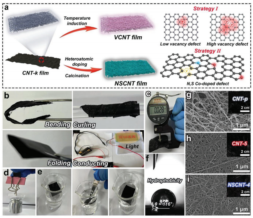 圖1. a)不同空位缺陷水平碳納米管薄膜制備過程的示意圖。b)通過折疊、卷曲、彎曲等簡單柔性測試及基于"NUAA"LED電路電導率驗證的實物圖像。c)碳納米管薄膜厚度測量。d)簡單力學性能測試。e)樣品親/疏水性測試。f)碳納米管薄膜接觸角測定。g)CNT-p、h)CNT-5和i)NSCNT-4的SEM圖像(插圖為樣品實物圖)。