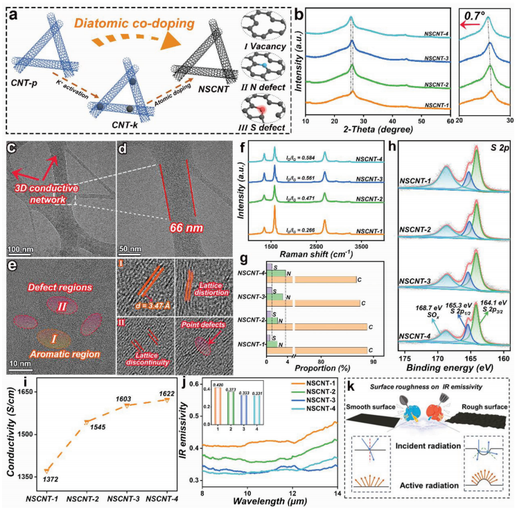 圖3. a) 氮/硫共摻雜策略引發缺陷的示意圖。b) XRD圖譜。c,d) NSCNT-4薄膜的透射電鏡(TEM)圖像。e) NSCNT-4的高分辨透射電鏡(HRTEM)圖像。f) 拉曼光譜。g) 原子比例統計。h) 硫元素2p軌道的XPS光譜。i) 電導率測試。j) 紅外發射率。k) 表面粗糙度對紅外發射率影響的示意圖。
