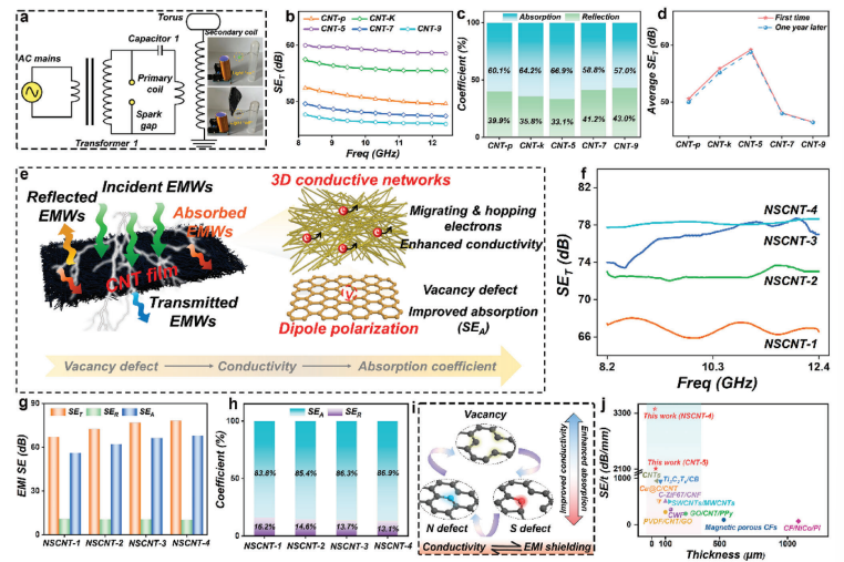 圖4. a) 特斯拉線圈工作原理示意圖(插圖為未添加/添加CNT薄膜的特斯拉線圈電路);VCNT薄膜的電磁干擾屏蔽特性:b) 總屏蔽效能(SET)值,c) 吸收與反射效能占總屏蔽效能的比重,d) 新制備樣品與放置一年后樣品的SET差異,e) VCN薄膜的電磁屏蔽機制示意圖;NSCNT薄膜的電磁屏蔽特性:f) SET值,g) SET、SER(反射效能)和SEA(吸收效能)值,h) 吸收與反射效能占比,i) 電磁屏蔽機制示意圖,j) 本研究與近期報道的碳基薄膜屏蔽性能對比。