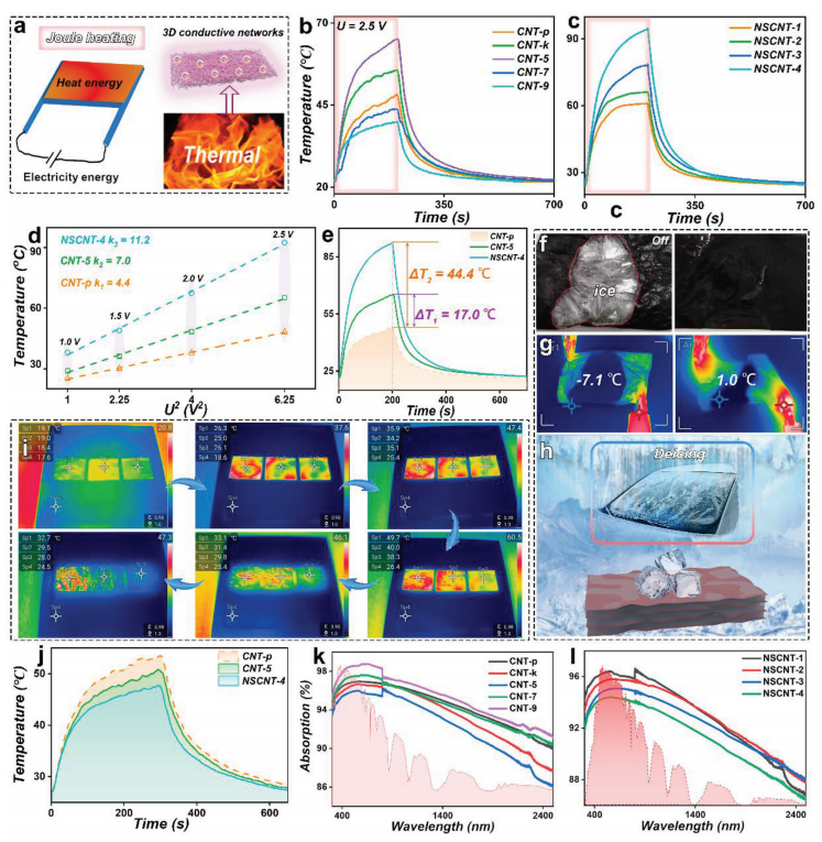 圖6. a) 電熱轉換過程示意圖。b) VCNT薄膜在2.5V外加電壓下的時間-溫度曲線。c) NSCNT薄膜在2.5V電壓下的時間-溫度曲線。d) 溫度與電壓U2的關系曲線及e) CNT-p、CNT-5和NSCNT-4薄膜的時間-溫度曲線對比。f) 除冰過程實物照片及g) 紅外熱成像圖。h) 除冰應用場景示意圖。i) 不同空位濃度CNT薄膜在模擬太陽光照射下的紅外圖像。j) CNT-p、CNT-5和NSCNT-4薄膜的表面輻射溫度對比。k) VCNT薄膜和l) NSCNT薄膜的紫外-可見吸收光譜。