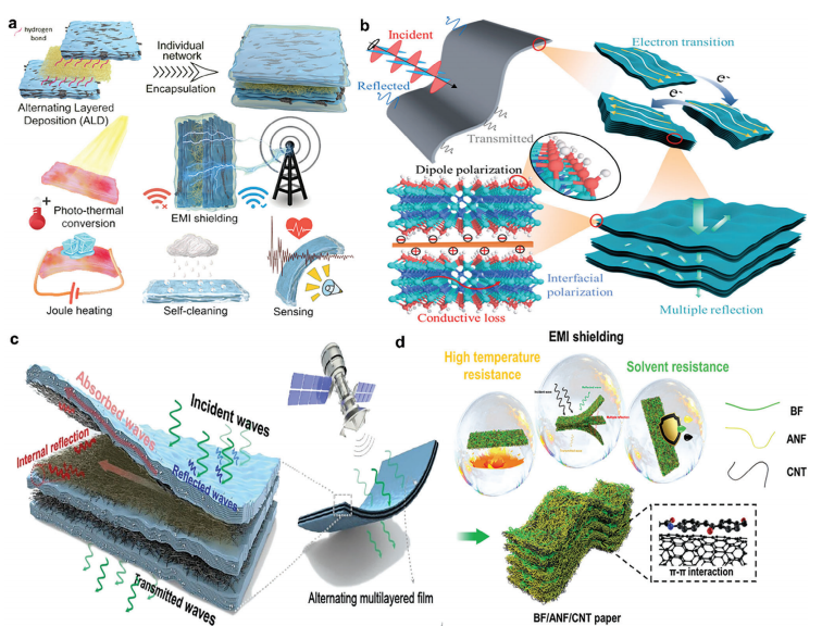 圖1. a,b) 高度導電薄結構中主要EMI屏蔽機制的示意圖