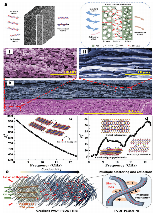 在21世紀,數字技術和通信系統的迅猛發展推動了社會進步。然而,這些技術的廣泛應用也引發了一種新的環境污染——電磁干擾(EMI)。EMI可能會干擾精密電子和生物系統,對人類生命和經濟構成潛在威脅。因此,開發EMI屏蔽材料已成為材料科學領域的熱門話題。傳統上,金屬如不銹鋼、銅、鋁和銀因其顯著的屏蔽效果而備受青睞。然而,這些金屬的高導電性往往導致通過反射來屏蔽電磁波,這可能會無意中產生二次電磁污染。為了應對這一挑戰,研究人員開始探索合成EMI屏蔽材料,包括導電聚合物、石墨烯、MXene、碳納米管 (CNT)和銀納米線(AgNW)等。然而,目前對吸收主導型結構的研究仍然有限,只有少數研究評估了吸收參數在屏蔽性能評價中的作用。