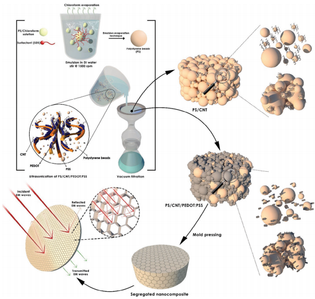 圖3. 聚苯乙烯(PS)微球制備PS/碳納米管(CNT)及PS/CNT/PEDOT:PSS納米復合材料的工藝流程示意圖。經許可改編自文獻[71a],版權歸2023年愛思唯爾所有。