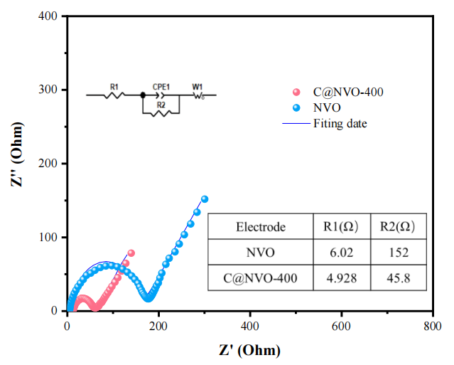 Figure S9.開(kāi)路電壓下C@NVO-400與NVO電極的電化學(xué)阻抗譜(EIS)及擬合曲線。