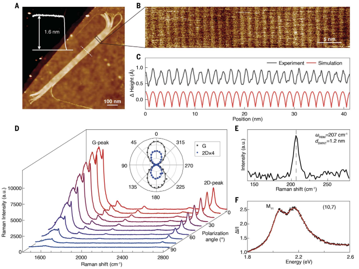圖2. 同手性單壁碳納米管(SWNT)范德華(vdW)晶體的表征。(A)典型SWNT陣列的原子力顯微鏡(AFM)圖像。插圖展示了從白色虛線提取的高度剖面(約1.6納米)。(B)圖(A)中SWNT陣列的放大高分辨率AFM形貌圖像,其中可以清晰地識別出緊密排列的單個SWNT。這些SWNT排列整齊且彼此平行,呈現出晶體結構。(C)圖(B)中SWNT陣列的實驗(黑線)和模擬(紅線)高度剖面,顯示出具有約1.53納米均勻周期的振蕩。(D)對應樣品在不同SWNT與入射光偏振方向夾角下的偏振拉曼光譜。插圖展示了拉曼G峰(黑色標記)和2D峰(藍色標記)在極坐標中的角度依賴強度。當偏振方向垂直于SWNT時,拉曼強度幾乎為零,反映了SWNT的近乎完美排列。a.u.,任意單位。(E)同一樣品的拉曼徑向呼吸模式(RBM),在207厘米-1處有一個單一的RBM峰,表明所有SWNT具有相同的直徑。(F)同一樣品的瑞利光譜,表明SWNT的手性均勻為(10, 7)。