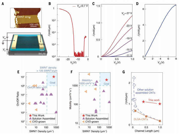 高開關比和電流密度:實現了接近10?的開關比和高達6 mA/μm的最大電流密度,這些性能指標優于或接近傳統硅基FET和之前報道的SWNT陣列或薄膜FET。