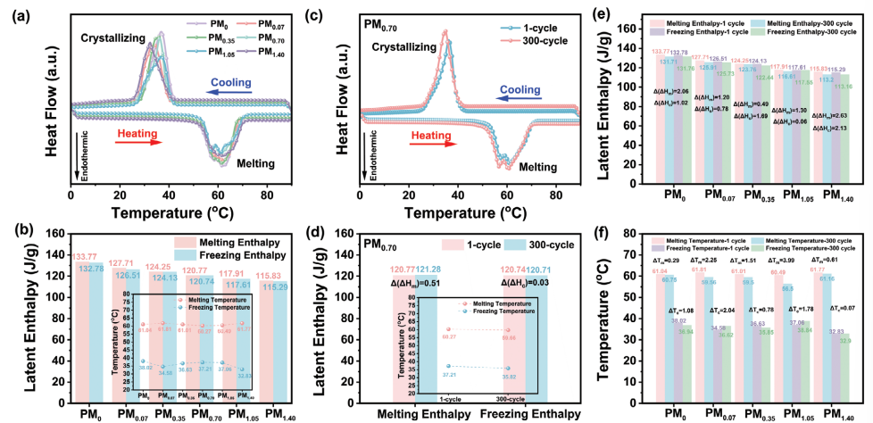 圖4d:提供了PM0.70復(fù)合薄膜在300次熱循環(huán)前后的相變溫度和相變焓。這些數(shù)據(jù)進(jìn)一步量化了熱循環(huán)對PM0.70復(fù)合薄膜相變行為和熱儲存性能的具體影響。