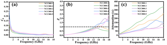 注:NCC800作為鈷-碳復合物,其ε"主要來自碳的導電損耗和界面極化,μ"則源于鈷的磁共振和渦流損耗。
