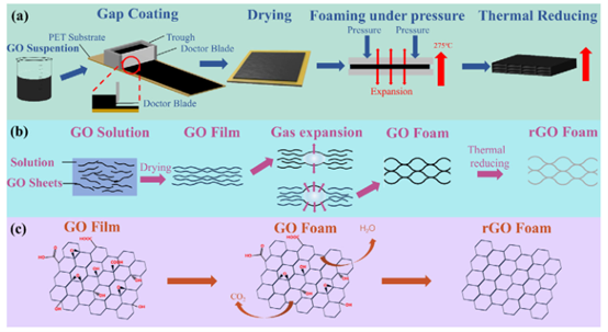 1.(a) 制備流程示意圖**:此部分通常以步驟圖形式,概括從原材料(如氧化石墨烯分散液)到最終產品(rGO泡沫)的完整工藝路徑。可能包括**涂布、干燥、加壓發泡、高溫還原/石墨化**等關鍵步驟。該圖旨在讓讀者快速把握整體制備方法。