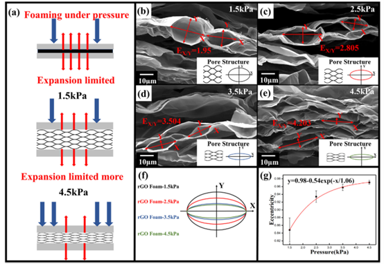 (e) 在4.5 kPa壓力下制備的rGO泡沫截面SEM圖像;