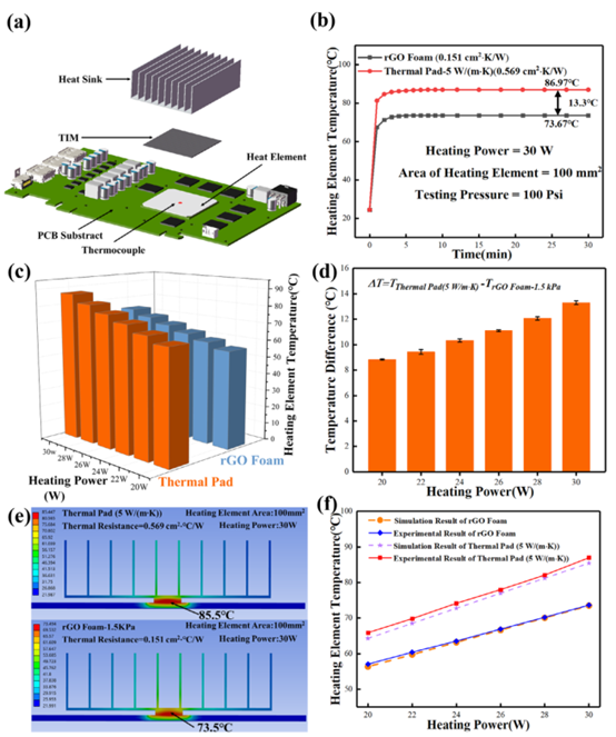 * **(f)** 通過**實驗與模擬對比**,驗證了模型的可靠性,并側面印證了rGO泡沫界面性能的優越性。