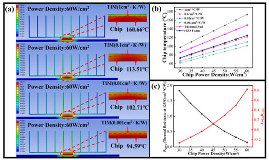 (a, b) 定量化地揭示了在高功率密度下,TIM熱阻是散熱性能的決定性因素。