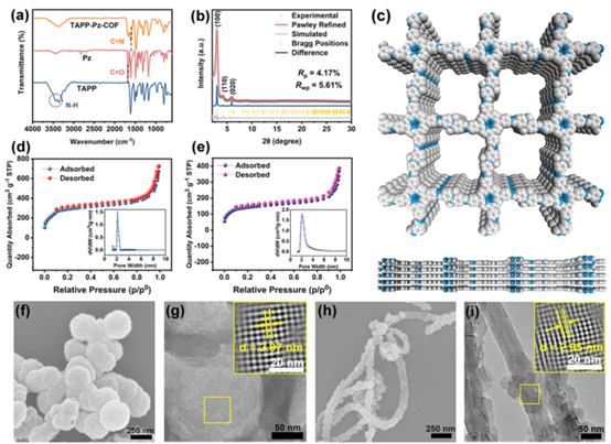 圖1 (a) TAPP-Pz-COF、Pz和TAPP的傅里葉變換紅外光譜(FT-IR)圖。(b) TAPP-Pz-COF的實驗和模擬粉末X射線衍射(PXRD)圖譜。(c) TAPP-Pz-COF模擬的AA堆積結構的頂視圖和側視圖。(d) TAPP-Pz-COF和(e) TAPP-Pz-COF-40%CNTs在77 K下的氮氣吸附和脫附曲線。(f) TAPP-Pz-COF的掃描電子顯微鏡(SEM)圖像和(g)高分辨率透射電子顯微鏡(HR-TEM)圖像。(h) TAPP-Pz-COF-40%CNTs的掃描電子顯微鏡(SEM)圖像和(i)高分辨率透射電子顯微鏡(HR-TEM)圖像。