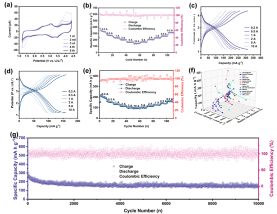 卓越的倍率與循環性能:材料展現出優異的倍率性能(從200到10,000 mA g?¹)和超長的循環壽命,在極高的電流密度(10 A g?¹)下循環10,000次后,容量保持率仍高達88%,庫侖效率接近100%。