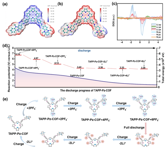 -)后的靜電勢圖;(c)TAPP-Pz-COF中鋰(Li)和氮(N)的計算態密度(DOS);(d)模擬的離子存儲路徑;(e)離子存儲過程中的結構演變。