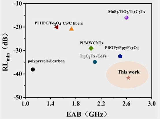 圖10. 本研究制備的復(fù)合材料與相關(guān)復(fù)合材料的電磁波吸收性能對比。