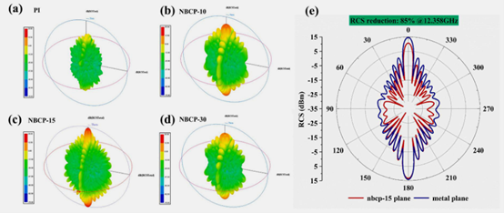 圖11. (a)-(d)PI與NBCP復(fù)合材料的RCS曲線三維圖及(e)NBCP-15涂層(紅色)與金屬表面(藍(lán)色)的極坐標(biāo)圖。