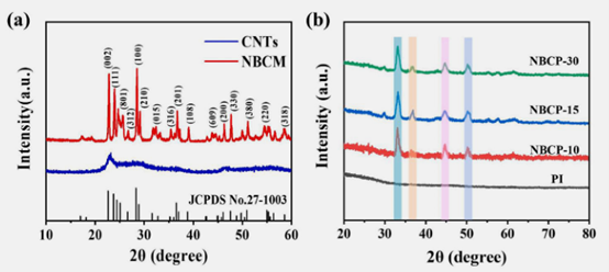 圖3. (a)CNT和NBCM填料及(b)PI與NBCP復(fù)合材料的XRD圖譜。