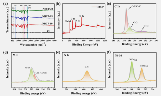 圖4. (a)PI與NBCP復(fù)合材料的FTIR光譜及(b-f)NBCP復(fù)合材料的XPS光譜。