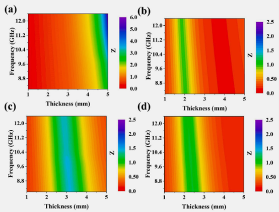 圖8. (a)PI、(b)NBCP-10、(c)NBCP-15及(d)NBCP-30復(fù)合材料的二維阻抗匹配等高線圖。