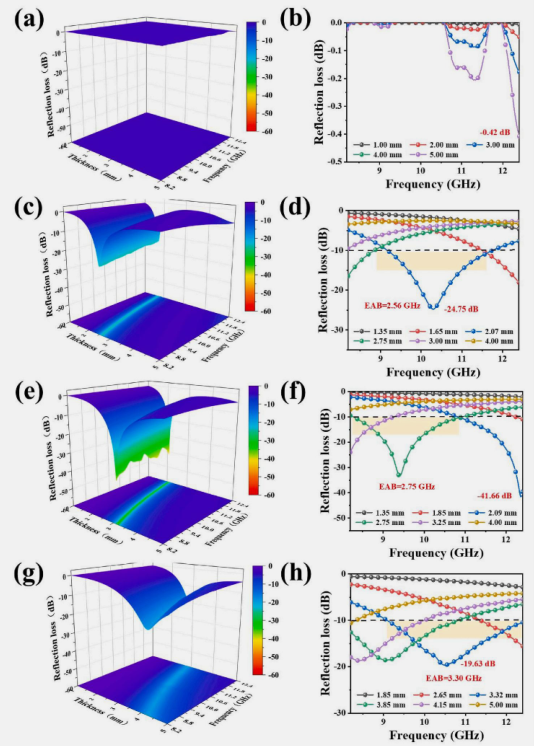 -3D曲線(a, c, e, g):以頻率、厚度為橫縱坐標(biāo),RL值為高度坐標(biāo),直觀呈現(xiàn)材料在全參數(shù)空間內(nèi)的吸波性能分布。