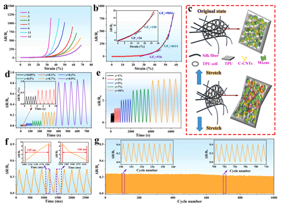 * **(c) 傳感機理闡釋**:通過示意圖直觀解釋了(b)中現象背后的物理機制。核心在于:一維CNT與二維MXene片在TPU基體和絲纖維表面形成**橋接導電網絡**。應變初期,模量不匹配導致橋接點優先斷開,電阻急劇變化(高GF);應變增大,纖維和TPU孔壁變形加劇,導致導電網絡進一步破壞,電阻持續躍升。