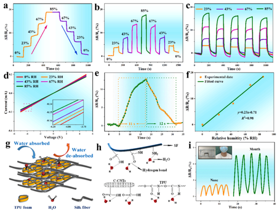 圖5. 柔性多孔CMT-nSF的濕度響應行為。(a) 對梯度上升與下降的相對濕度環境的響應。(b) 在不同相對濕度環境下的一周期響應。(c) 在不同相對濕度環境下的動態循環響應。(d) 不同相對濕度環境下的I-V曲線。(e) 在67%相對濕度環境下的響應與恢復時間。(f) 最大ΔR/R?與對應相對濕度值之間的關系。(g-h) CMT-nSF對濕度的敏感性機理模型。(i) 分別通過快速呼吸模式,對由鼻和口引起的人體呼吸濕度的響應。