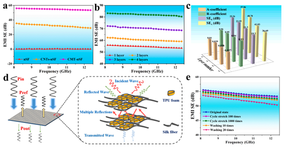 圖7. 復合材料的電磁干擾屏蔽性能。(a) 單層nSF、CNT-nSF及CMT-nSF在8.2-12.4 GHz頻率范圍內的電磁干擾屏蔽性能。(b) 不同層數CMT-nSF在8.2-12.4 GHz頻率范圍內的電磁干擾屏蔽性能。(c) 8.2 GHz頻率下,不同層數CMT-nSF的SE、SE_A、A和R值。(d) CMT-nSF的電磁干擾屏蔽機理示意圖。(e) 不同環境條件下CMT-nSF的電磁干擾屏蔽性能。