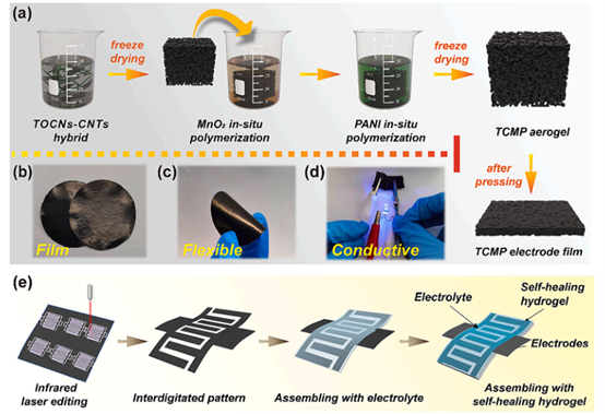 圖1. (a) 通過MnO?和PANI原位聚合制備TCMP氣凝膠的流程。(b)-(d)展示了TCMP電極的表征:(b)形貌,(c)柔韌性,(d)導電性。(e)展示了以可圖案化的TCMP雜化薄膜為電極、PVA/H?SO?凝膠為電解質、動態交聯的CNF/PB水凝膠為自修復電極基質的柔性自修復超級電容器的組裝流程示意圖。
