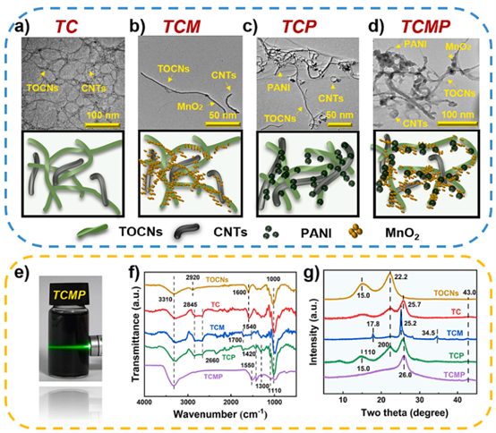 圖2. (a) TC, (b) TCM, (c) TCP 和 (d) TCMP 雜化懸浮液的顯微圖像及對應的結構示意圖。(e) TCMP在水溶液中均勻分散的數碼照片。(f) 和 (g) 分別為不同TOCNs基氣凝膠的FTIR光譜和XRD圖譜。所有表征均重復三次。