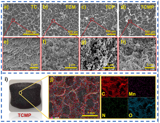 圖3. 不同氣凝膠的形貌。TC (a, e)、TCM (b, f)、TCP (c, g) 和 TCMP (d, h) 的掃描電鏡圖像。(i) TCMP氣凝膠的數碼照片。(j) 能譜儀面掃圖譜,以不同顏色展示TCMP氣凝膠中C、Mn、N、O元素的空間分布。所有實驗均重復三次。