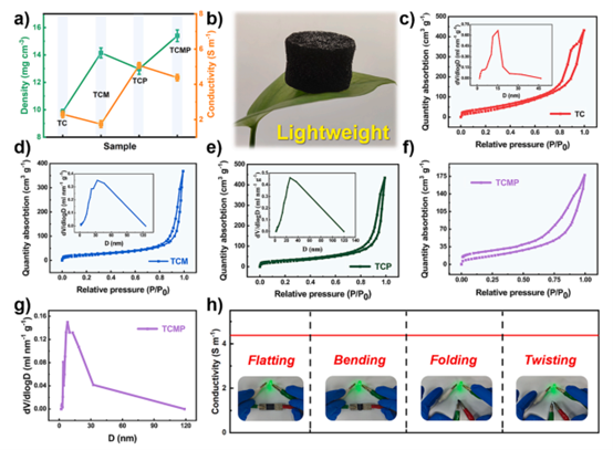 圖4. (a) 氣凝膠的密度與電導率。誤差棒代表五次重復測量的標準偏差(n=5)。(b) 展示TCMP氣凝膠輕質特性的數碼照片。(c-g) 不同氣凝膠的氮氣吸附/脫附曲線與孔徑分布曲線:(c) TC氣凝膠,(d) TCM氣凝膠,(e) TCP氣凝膠,(f-g) TCMP氣凝膠。(h) 導電的TCMP薄膜在折疊、彎曲和扭轉形變后,在連通電路中作為導線點亮發光二極管的演示。