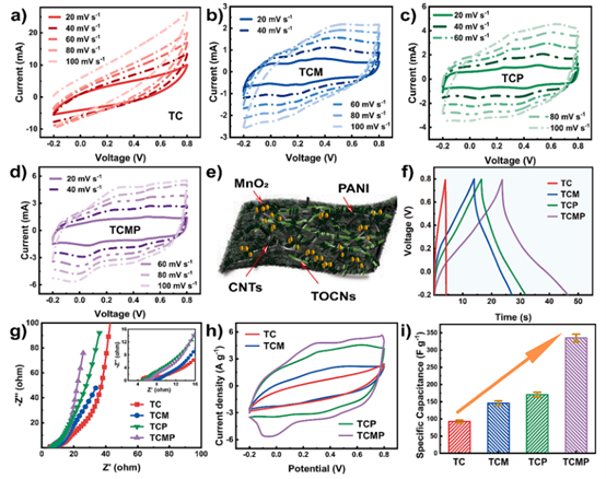 (i) 定量給出了四種電極在相同電流密度(0.6 A g?¹)下的質量比電容,并帶有誤差棒。這是最核心的性能對比數據之一,能清晰證明TCMP電極相對于TC、TCM、TCP電極的電容優勢,以及MnO?與PANI的協同效應。